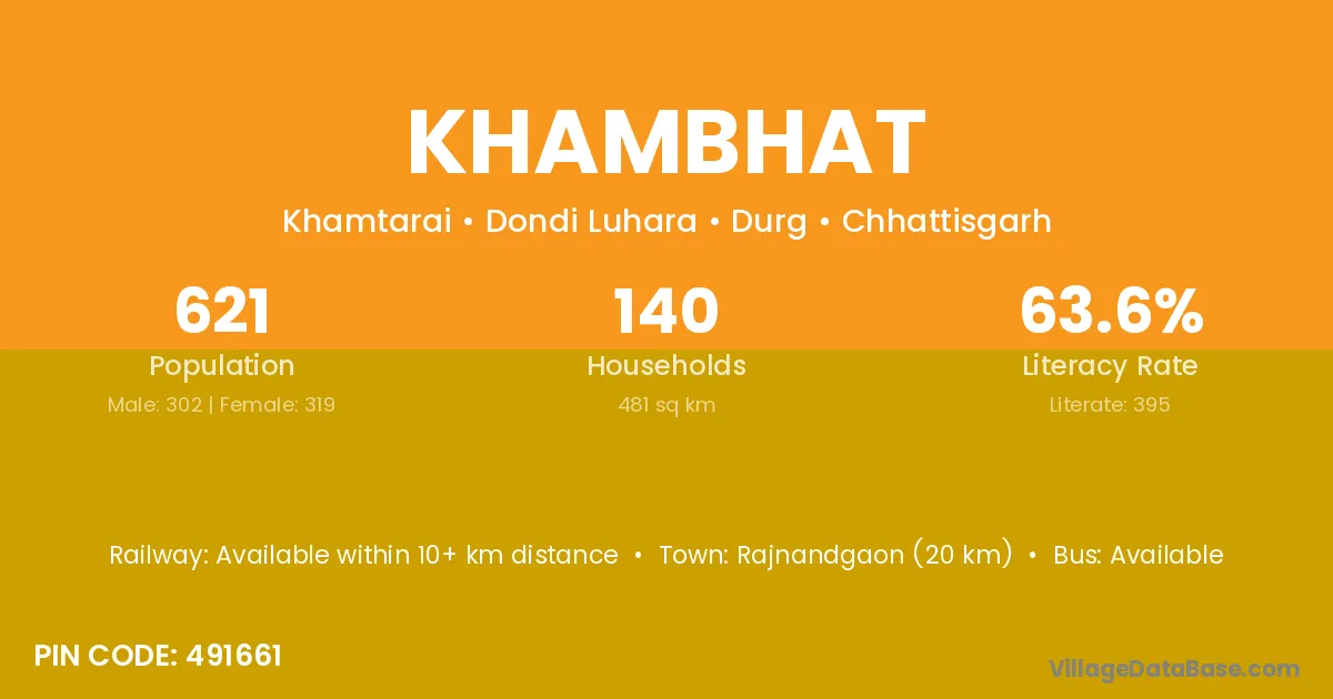 Rajnandgaon (20 km) is the nearest town to Khambhat village for major economic activities and is located approximately 20 km away.