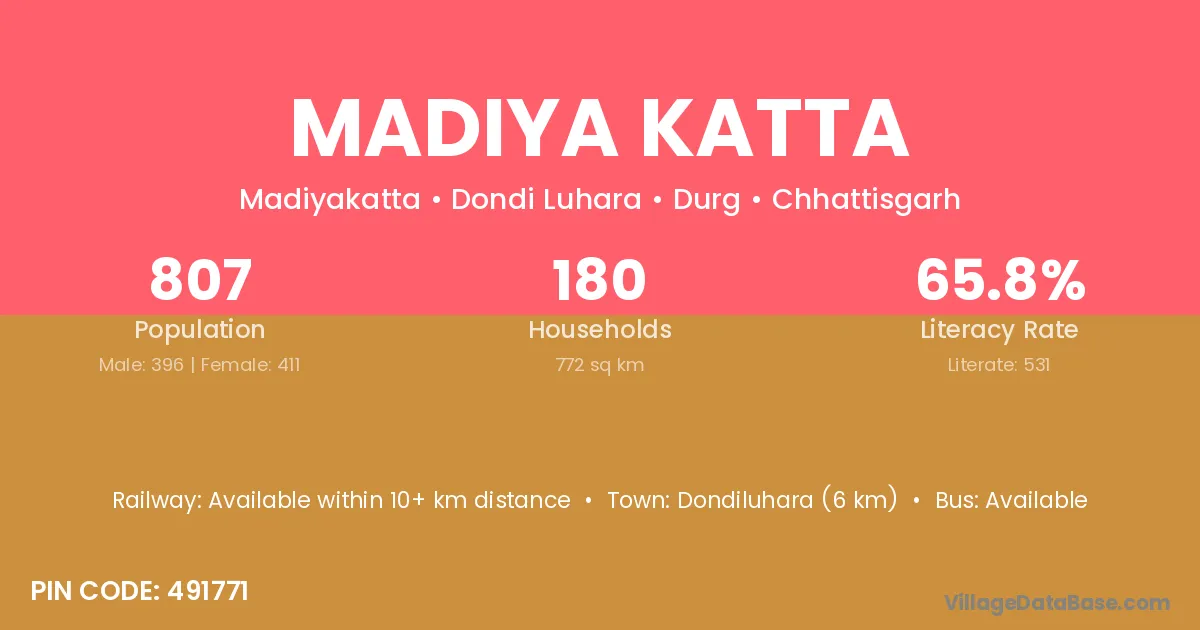 Dondiluhara (6 km) is the nearest town to Madiya Katta village for major economic activities and is located approximately 6 km away.