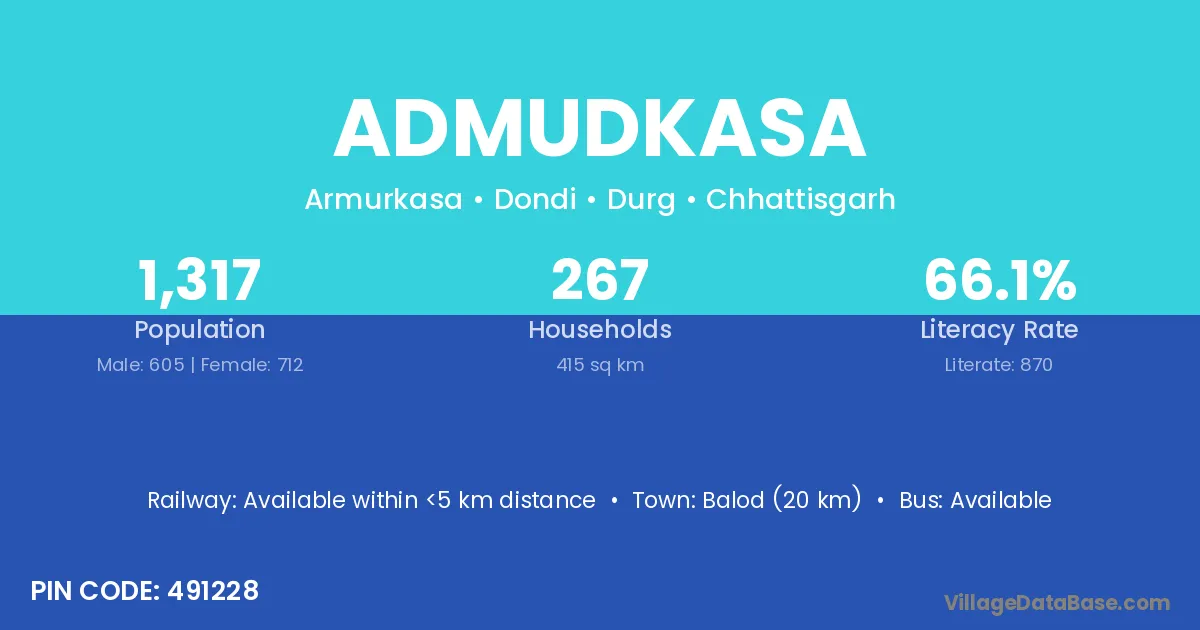 Balod (20 km) is the nearest town to Admudkasa village for major economic activities and is located approximately 20 km away.