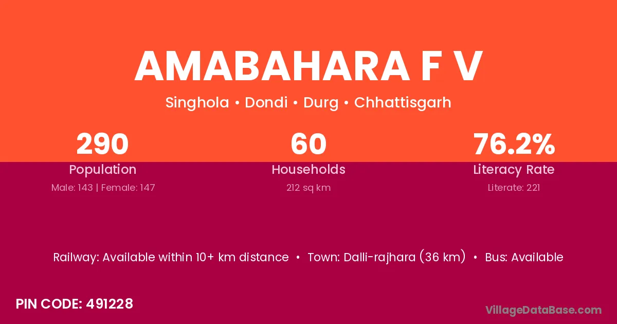 Dalli-rajhara (36 km) is the nearest town to Amabahara F V village for major economic activities and is located approximately 36 km away.