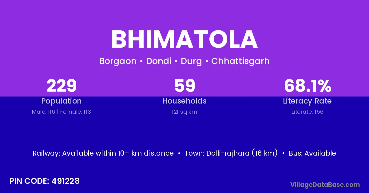 Dalli-rajhara (16 km) is the nearest town to Bhimatola village for major economic activities and is located approximately 16 km away.