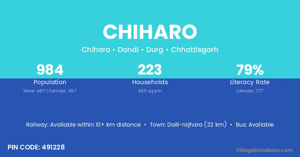 Dalli-rajhara (32 km) is the nearest town to Chiharo village for major economic activities and is located approximately 32 km away.