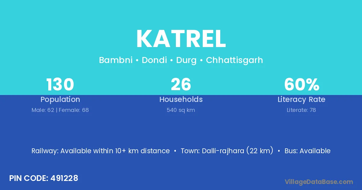 Dalli-rajhara (22 km) is the nearest town to Katrel village for major economic activities and is located approximately 22 km away.