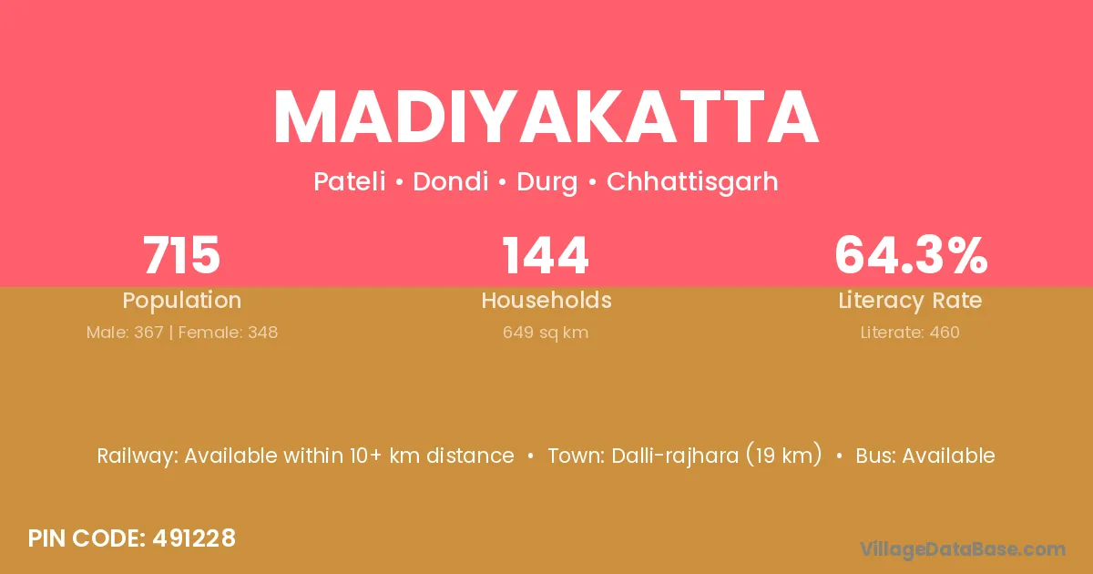 Dalli-rajhara (19 km) is the nearest town to Madiyakatta village for major economic activities and is located approximately 19 km away.