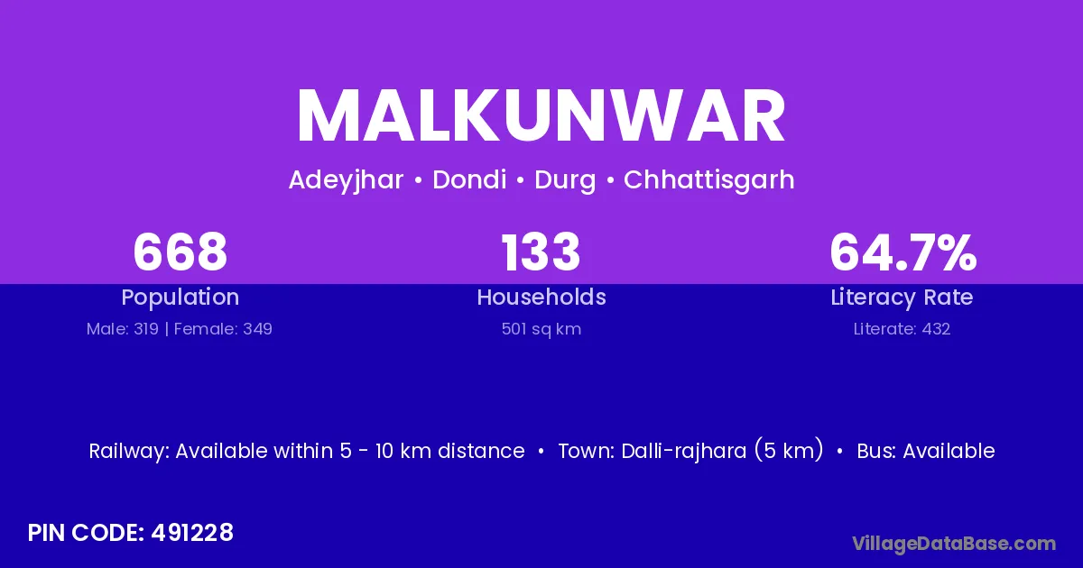 Dalli-rajhara (5 km) is the nearest town to Malkunwar village for major economic activities and is located approximately 5 km away.