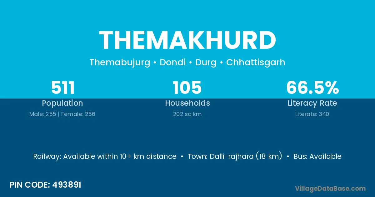 Dalli-rajhara (18 km) is the nearest town to Themakhurd village for major economic activities and is located approximately 18 km away.
