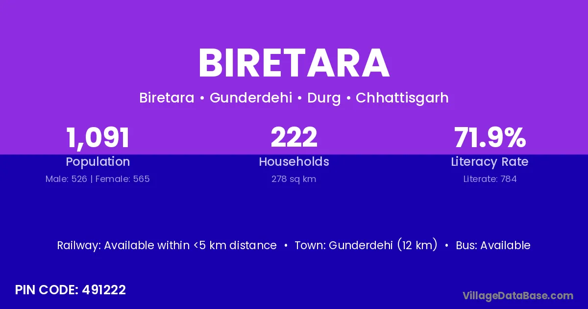 Gunderdehi (12 km) is the nearest town to Biretara village for major economic activities and is located approximately 12 km away.