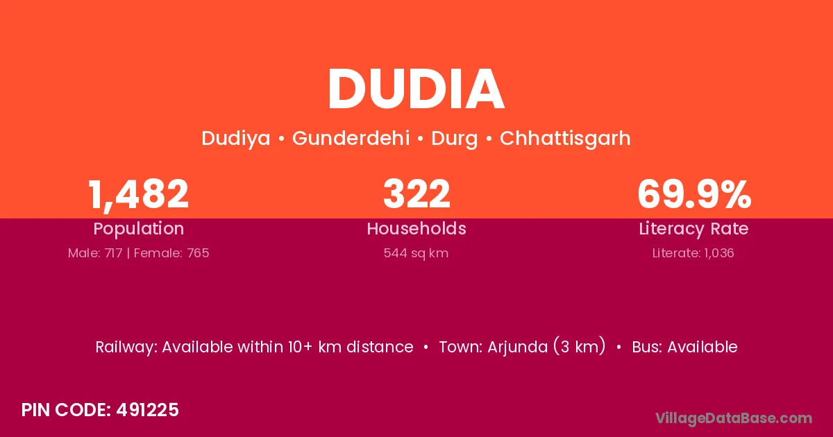 According to Census 2011 information, the village code of Dudia village is 491225.