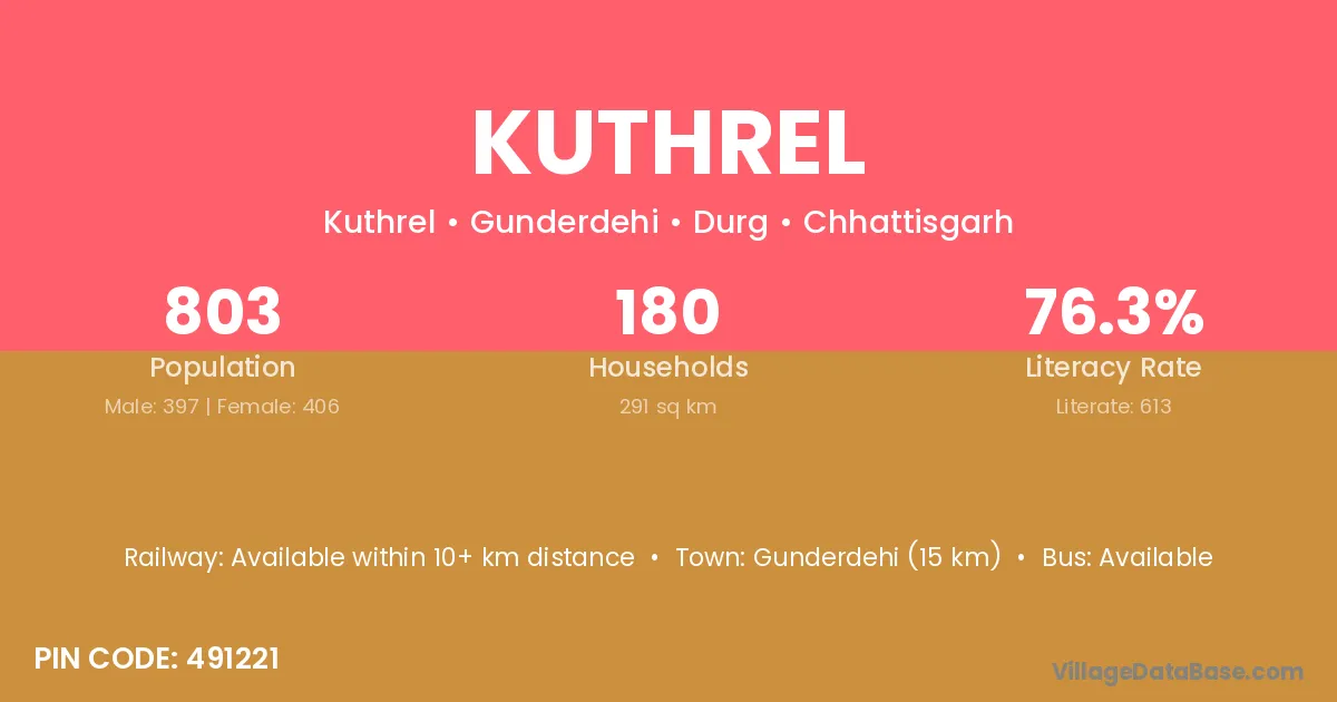 Gunderdehi (15 km) is the nearest town to Kuthrel village for major economic activities and is located approximately 15 km away.