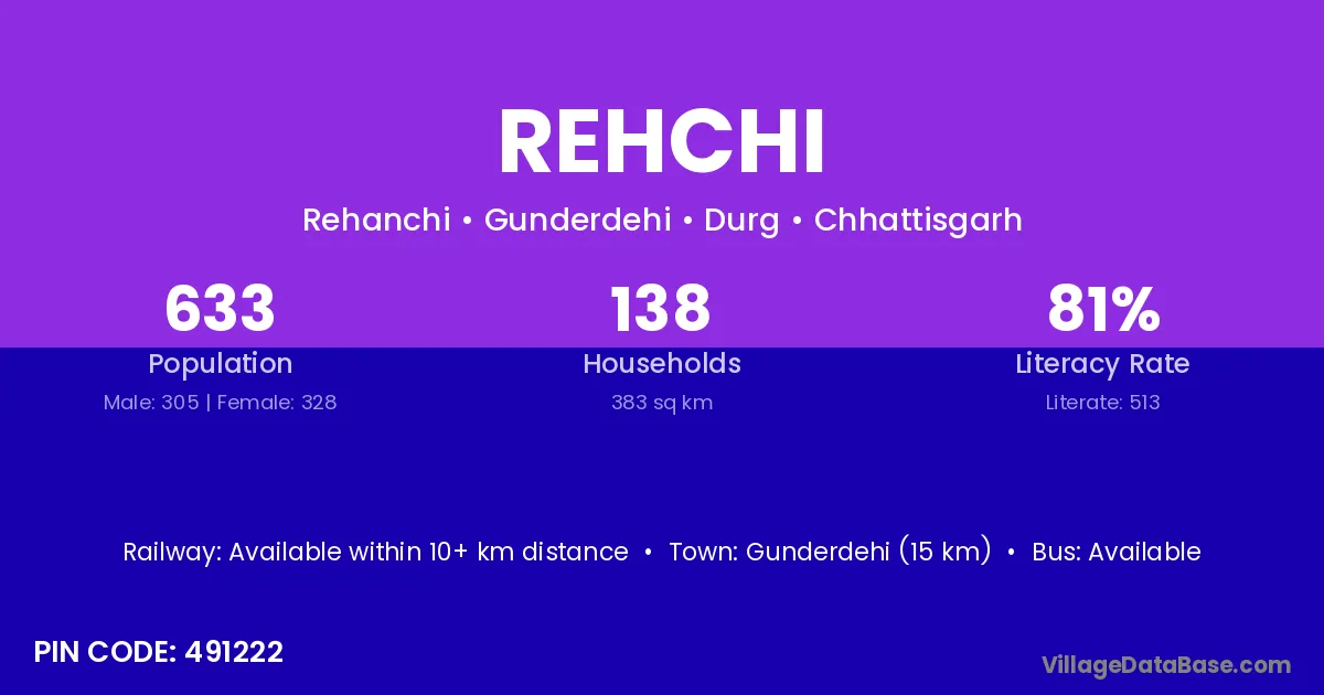 Gunderdehi (15 km) is the nearest town to Rehchi village for major economic activities and is located approximately 15 km away.