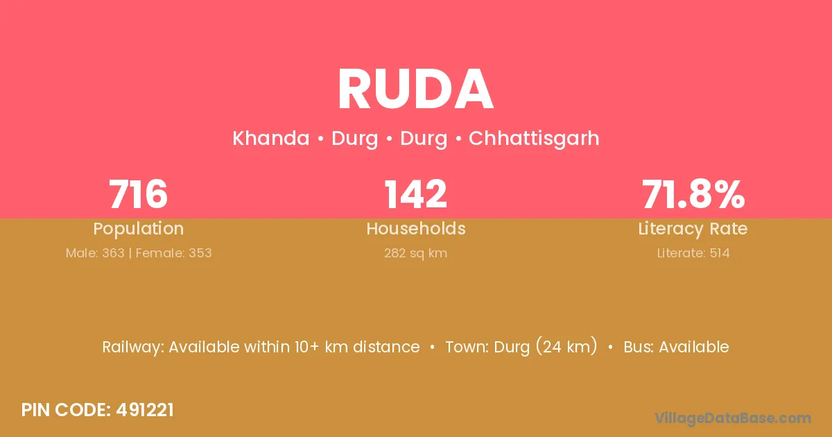 Gunderdehi (3 km) is the nearest town to Ruda village for major economic activities and is located approximately 3 km away.