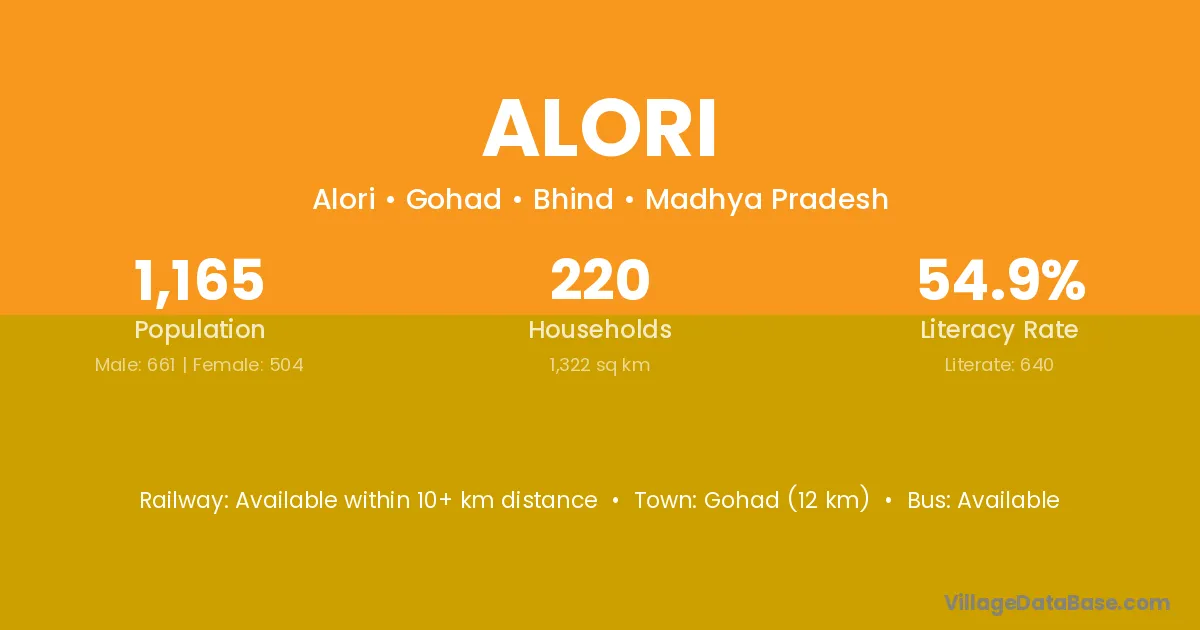 The literacy rate of Alori village is 67.70%. Male literacy stands at 76.62% and female literacy at 59.52%.