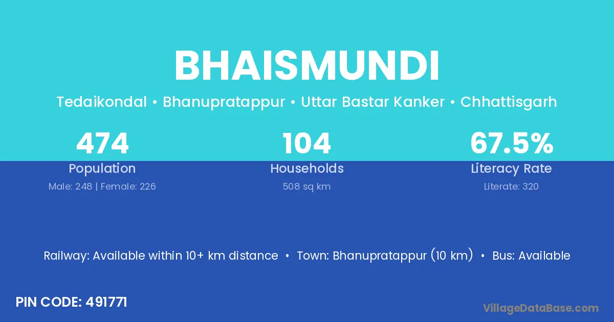 Gurur (26 km) is the nearest town to Bhaismundi village for major economic activities and is located approximately 26 km away.