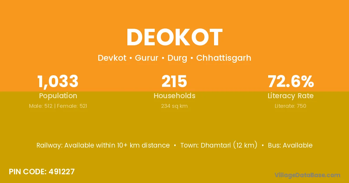 Dhamtari (12 km) is the nearest town to Deokot village for major economic activities and is located approximately 12 km away.
