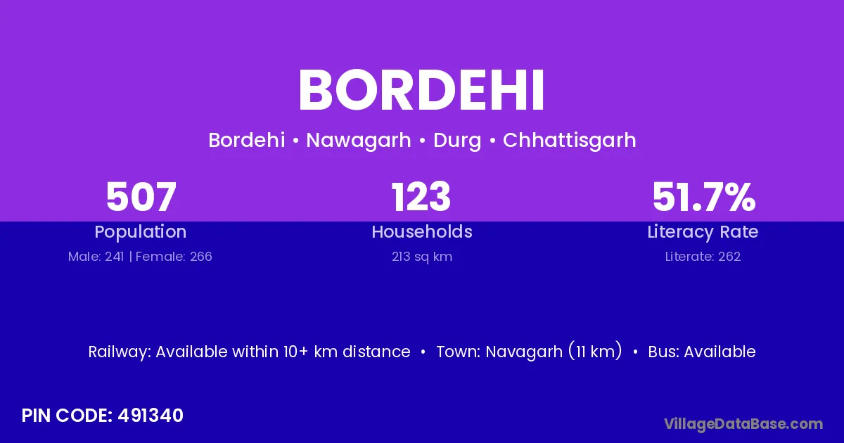 Bordehi village is located in the Nawagarh Tehsil of the Durg district in Chhattisgarh .