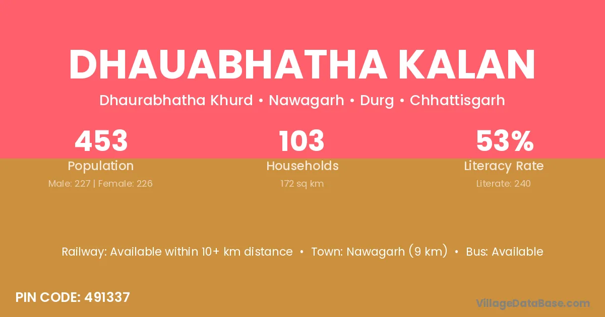 Dhauabhatha Kalan village has a total population of 453 people, of which 227 are males and 226 are females.