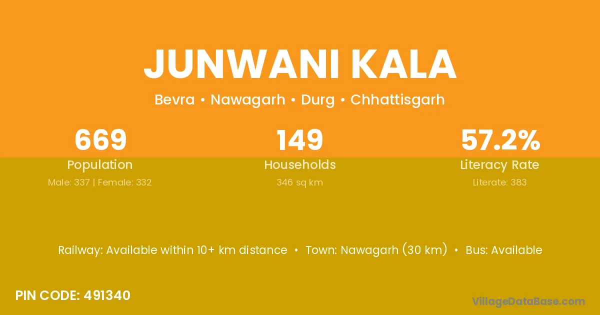 Nawagarh (30 km) is the nearest town to Junwani Kala village for major economic activities and is located approximately 30 km away.