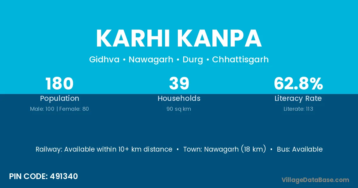 Nawagarh (18 km) is the nearest town to Karhi Kanpa village for major economic activities and is located approximately 18 km away.