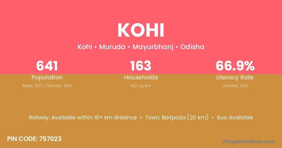 The literacy rate of Kohi village is 67.33%. Male literacy stands at 75.47% and female literacy at 59.28%.