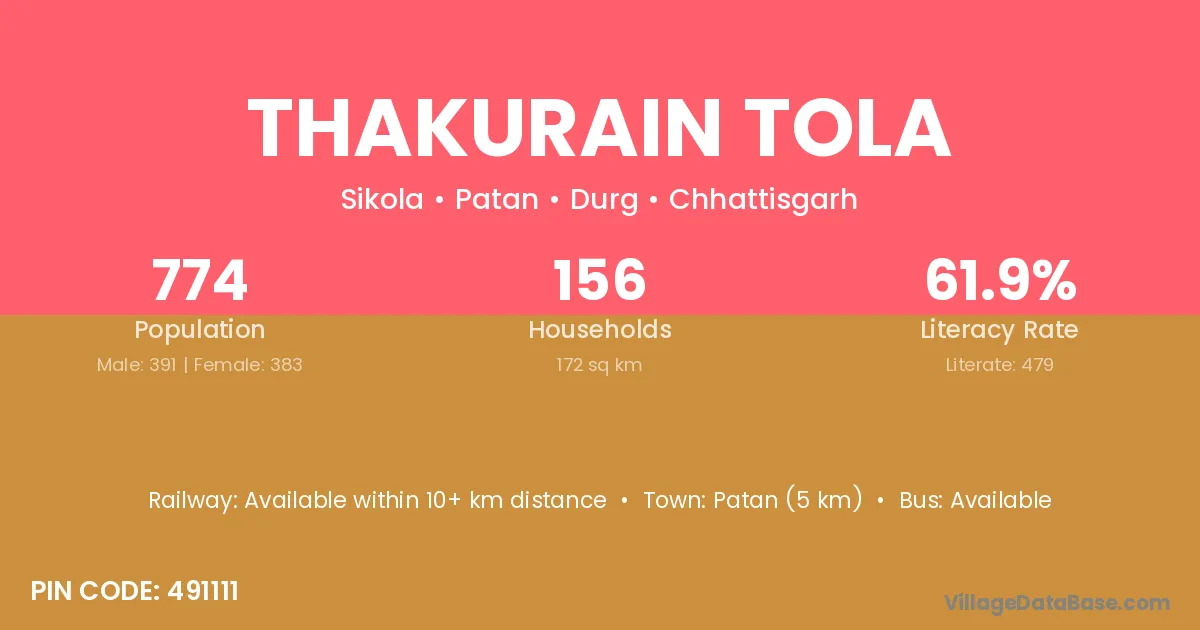 Thakurain Tola village has a total population of 774 people, of which 391 are males and 383 are females.