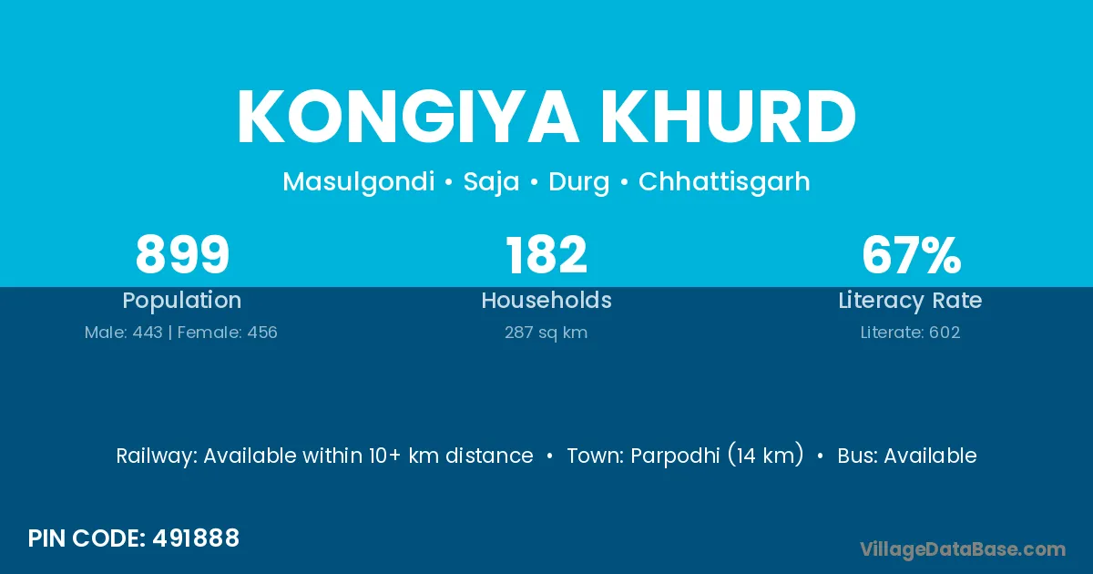 Kongiya Khurd village has a total population of 899 people, of which 443 are males and 456 are females.