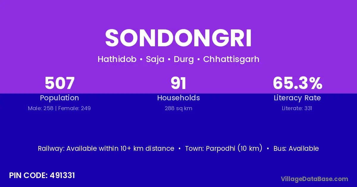 Parpodhi (10 km) is the nearest town to Sondongri village for major economic activities and is located approximately 10 km away.