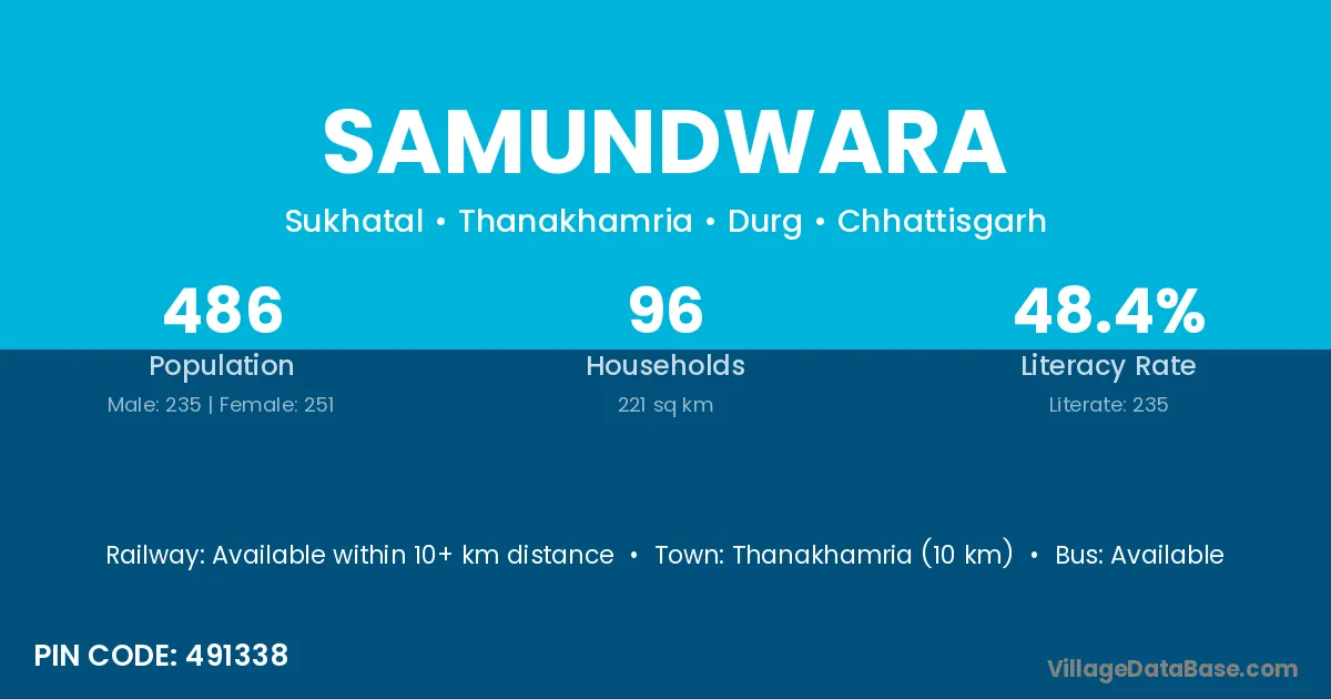 Thanakhamria (10 km) is the nearest town to Samundwara village for major economic activities and is located approximately 10 km away.
