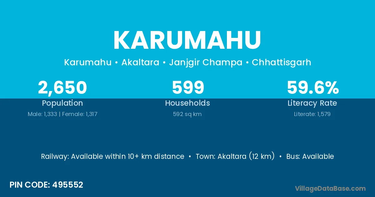Akaltara (12 km) is the nearest town to Karumahu village for major economic activities and is located approximately 12 km away.