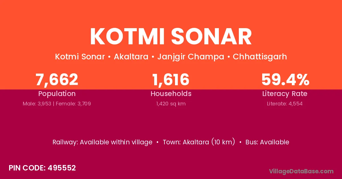 Akaltara (10 km) is the nearest town to Kotmi Sonar village for major economic activities and is located approximately 10 km away.