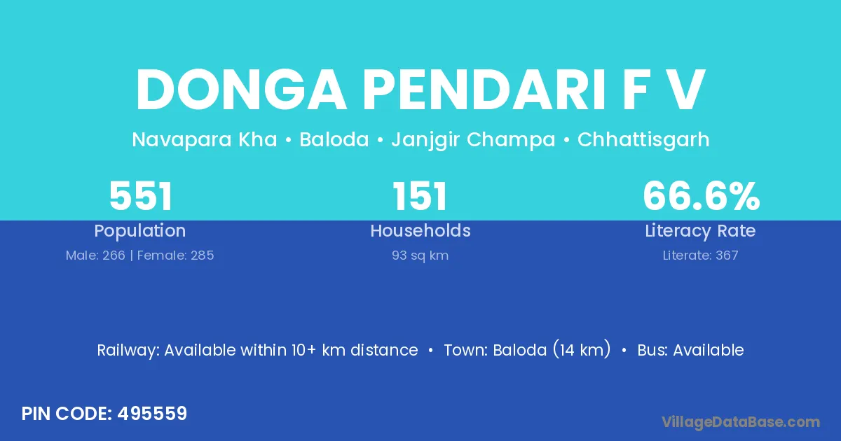 Baloda (14 km) is the nearest town to Donga Pendari F V village for major economic activities and is located approximately 14 km away.