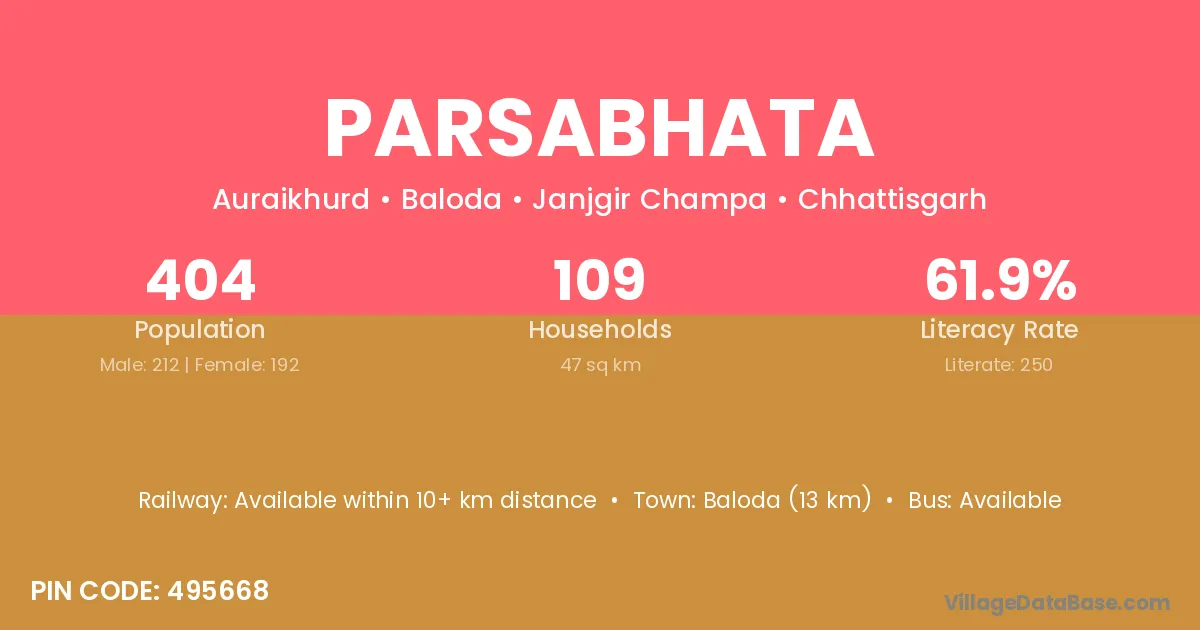 Baloda (13 km) is the nearest town to Parsabhata village for major economic activities and is located approximately 13 km away.
