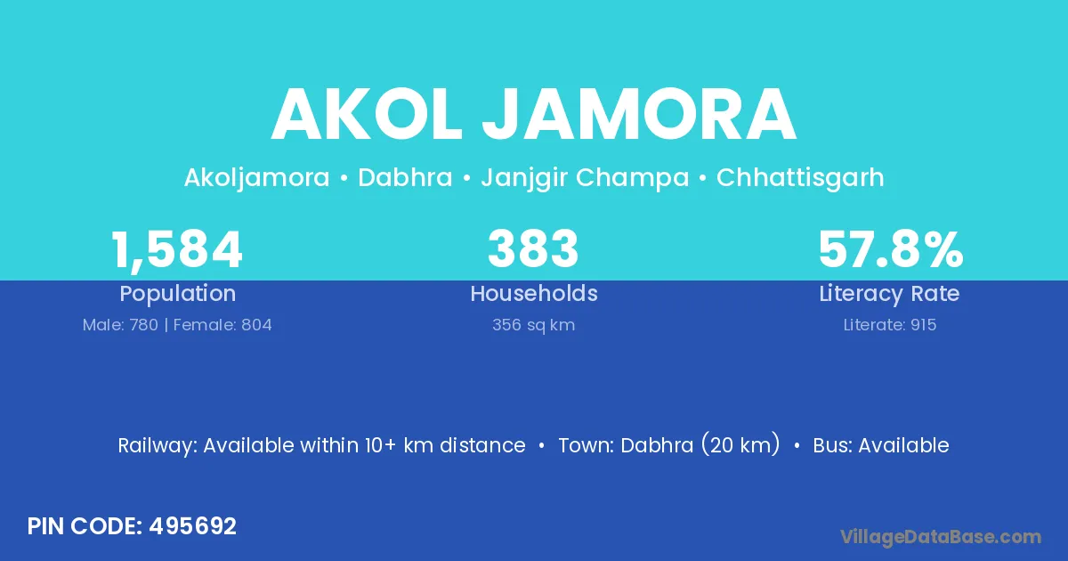 Dabhra (20 km) is the nearest town to Akol Jamora village for major economic activities and is located approximately 20 km away.