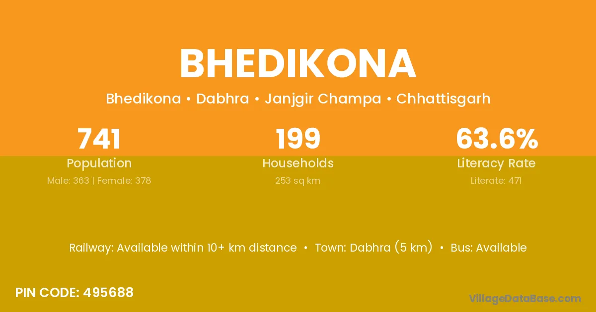 Bhedikona village has a total population of 741 people, of which 363 are males and 378 are females.