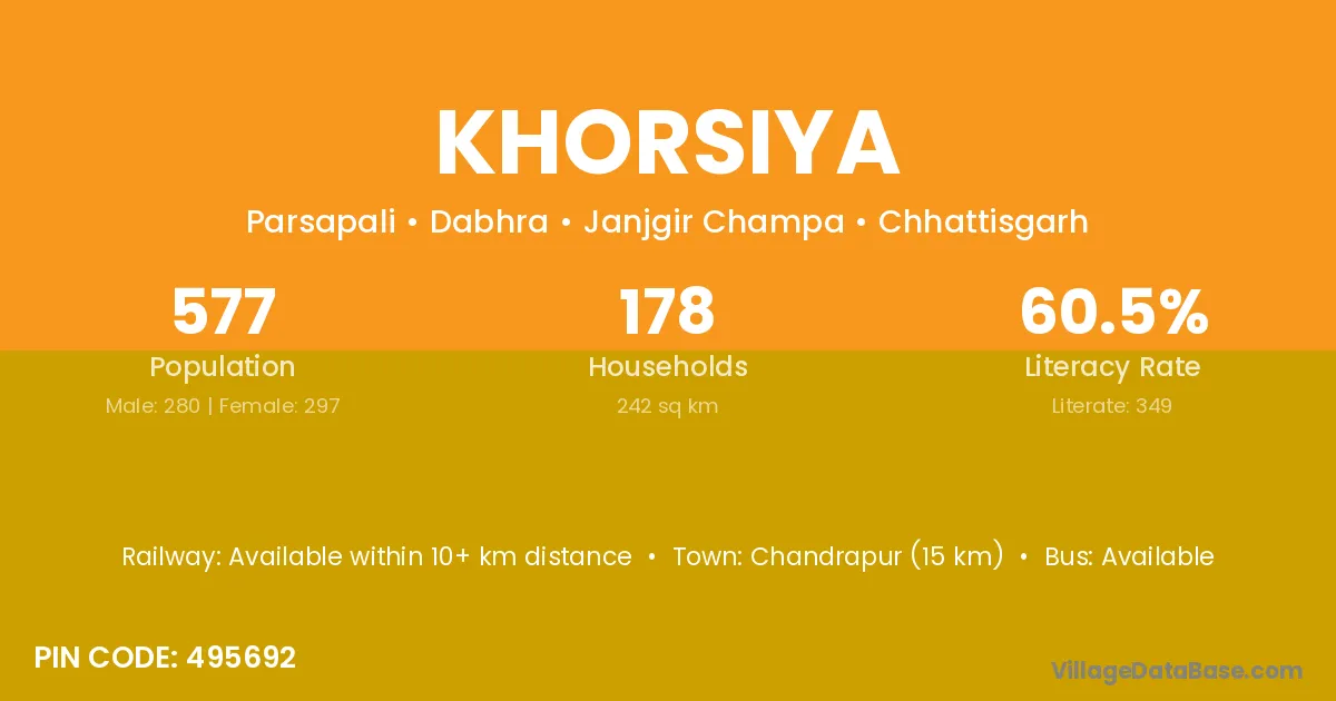 Khorsiya village has a total population of 577 people, of which 280 are males and 297 are females.