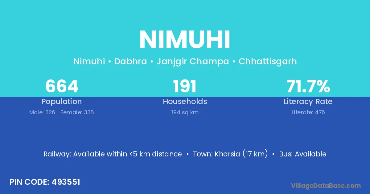 Kharsia (17 km) is the nearest town to Nimuhi village for major economic activities and is located approximately 17 km away.