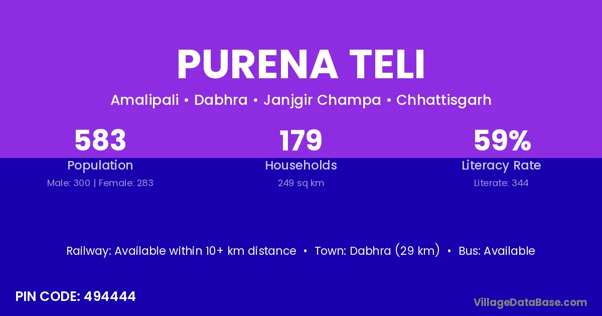 Dabhra (29 km) is the nearest town to Purena Teli village for major economic activities and is located approximately 29 km away.
