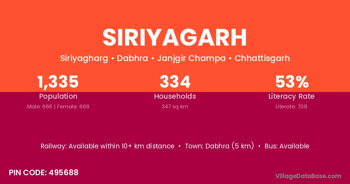 Siriyagarh village has a total population of 1,335 people, of which 666 are males and 669 are females.
