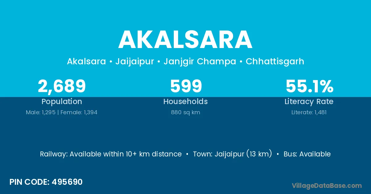 Jaijaipur (13 km) is the nearest town to Akalsara village for major economic activities and is located approximately 13 km away.