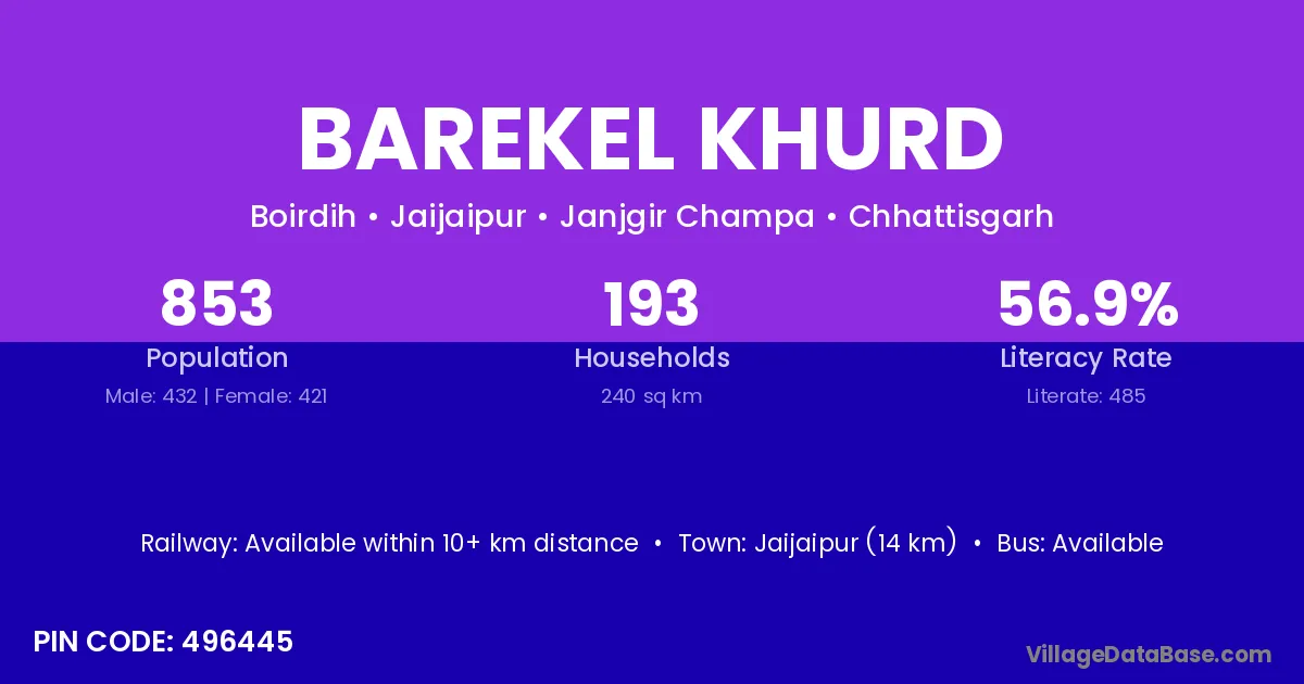 Jaijaipur (14 km) is the nearest town to Barekel Khurd village for major economic activities and is located approximately 14 km away.