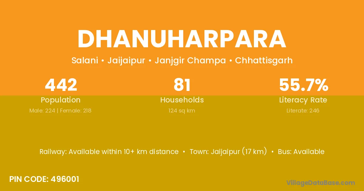 Dhanuharpara village has a total population of 442 people, of which 224 are males and 218 are females.
