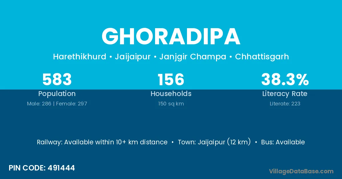 Jaijaipur (12 km) is the nearest town to Ghoradipa village for major economic activities and is located approximately 12 km away.