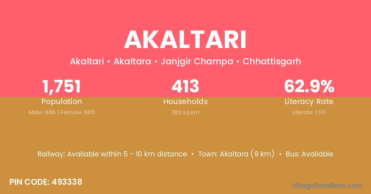 Champa (16 km) is the nearest town to Akaltari village for major economic activities and is located approximately 16 km away.