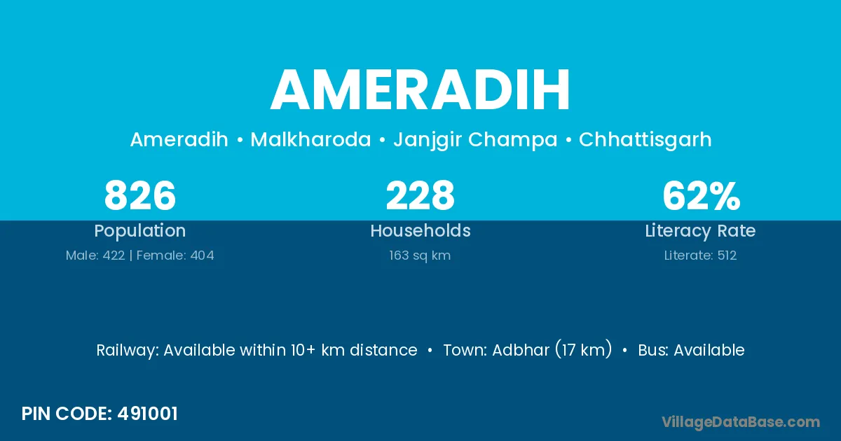 Adbhar (17 km) is the nearest town to Ameradih village for major economic activities and is located approximately 17 km away.