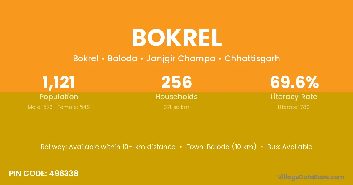 According to Census 2011 information, the village code of Bokrel village is 496223.