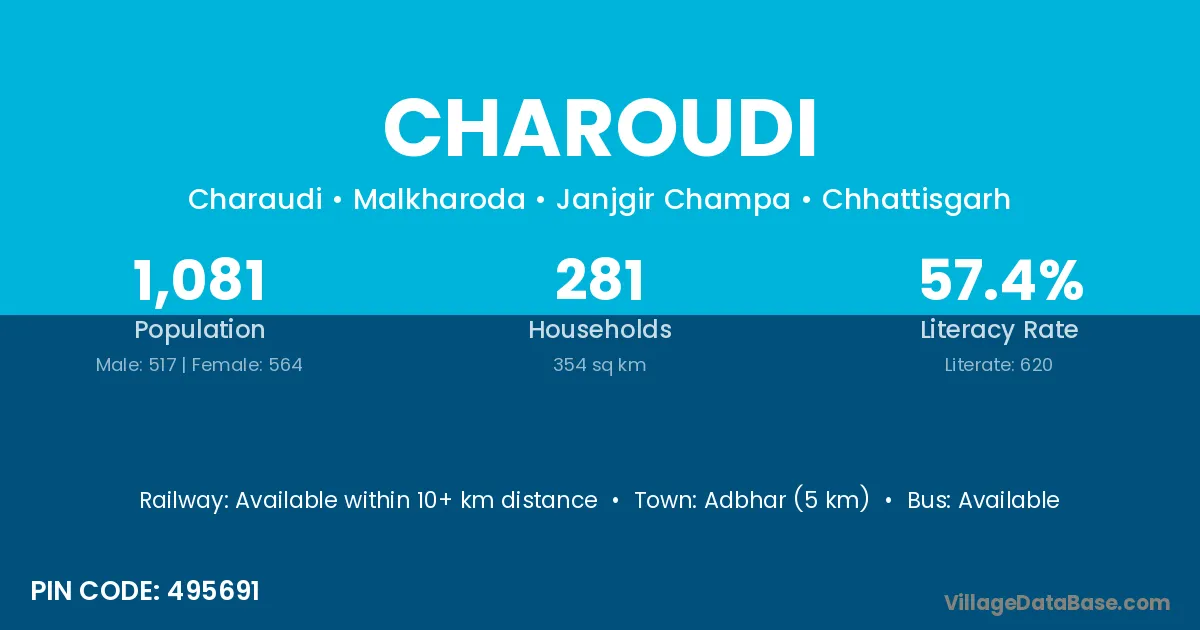 Adbhar (5 km) is the nearest town to Charoudi village for major economic activities and is located approximately 5 km away.