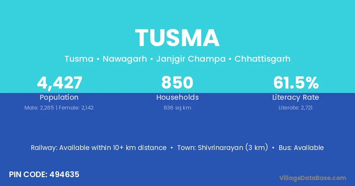 Shivrinarayan (3 km) is the nearest town to Tusma village for major economic activities and is located approximately 3 km away.