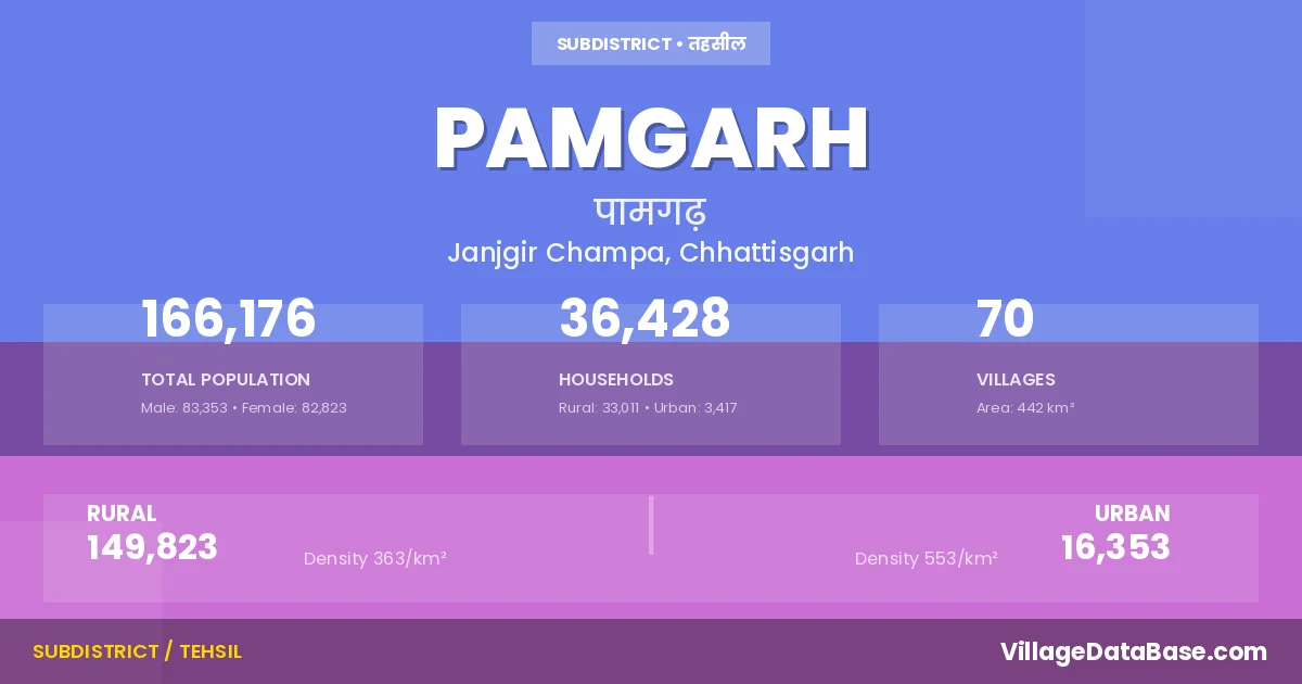 Pamgarh is a town and Tehsil in the Janjgir Champa district of the Chhattisgarh. In India, a Tehsil is a subdivision of a district responsible for the administration and revenue collection of a specific area within the district. Tehsils play a crucial role in the local governance structure, contributing significantly to the development and administration of their communities.