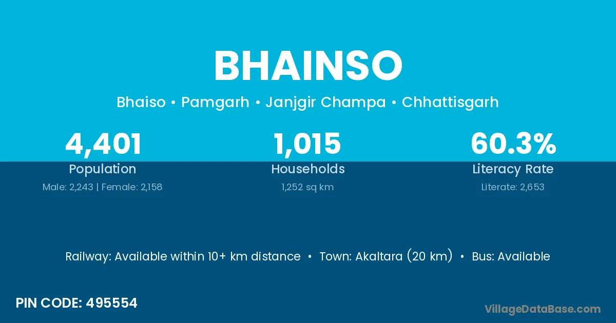 Akaltara (20 km) is the nearest town to Bhainso village for major economic activities and is located approximately 20 km away.