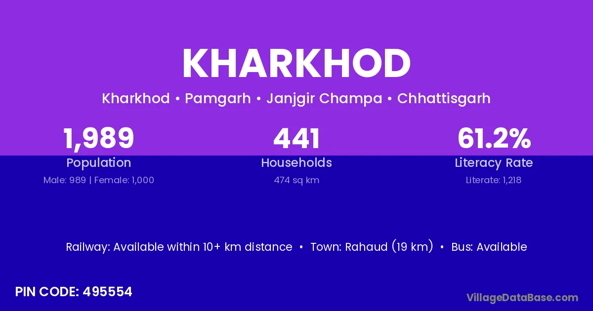 Kharkhod village has a total population of 1,989 people, of which 989 are males and 1,000 are females.
