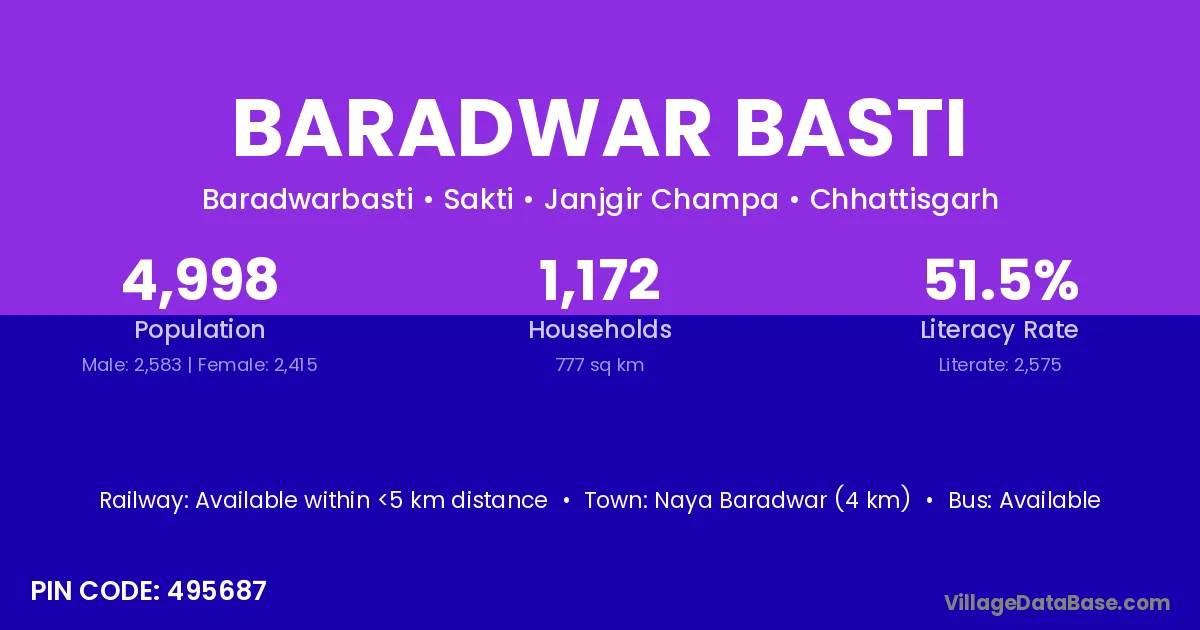 Baradwar Basti village has a total population of 4,998 people, of which 2,583 are males and 2,415 are females.
